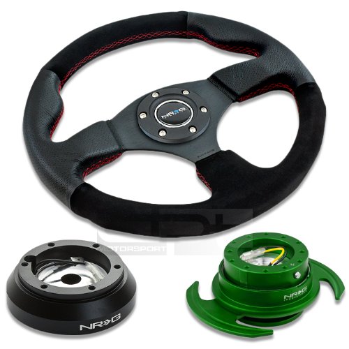 NRG-SRK-160H+012R-S+650GR, NRG Innovations 12.5" 320mm Black Leather Red Stitch Suede Grip Racing Steering Wheel Combo with 6 Hole Short Hub Adapter with Gen 3.0 with Handle Green Quick Release Kit SRK-160H
