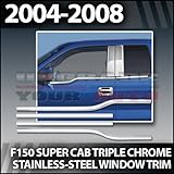 | ✚✚✚ 04-08 F150 Super-Cab Triple Chrome Window Trim Molding 4pcs 2004 2005 2006 2007 2008 Ford F-150 Super-Cab Triple Chrome Window Trim "4-piece" Set Custom Chrome Window Sill Trim made of the highest grade 304 Stainless Steel, then plated with a thick triple chromed mirror finish. Each trim piece has smooth beveled edges, then formed to fit over every curve of your Ford F-150's original window trim with precision. Each Chromed Window trim piece PERFECTLY installs over your F150's existing window belt trim with automotive-grade 3M adhesive (already installed ready for installation). Window trim installation typically installs in under 15 minutes of your time (With No Tools)!! Once installed your new triple chrome window belt trim will remain VERY secure and the superior finished product will give you that Factory OEM look.